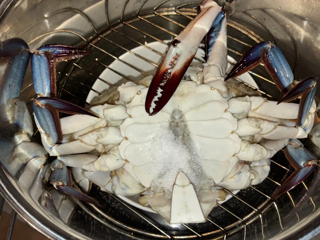 まずはワタリガニのふんどしに塩を入れて蒸し器で蒸しあげます。