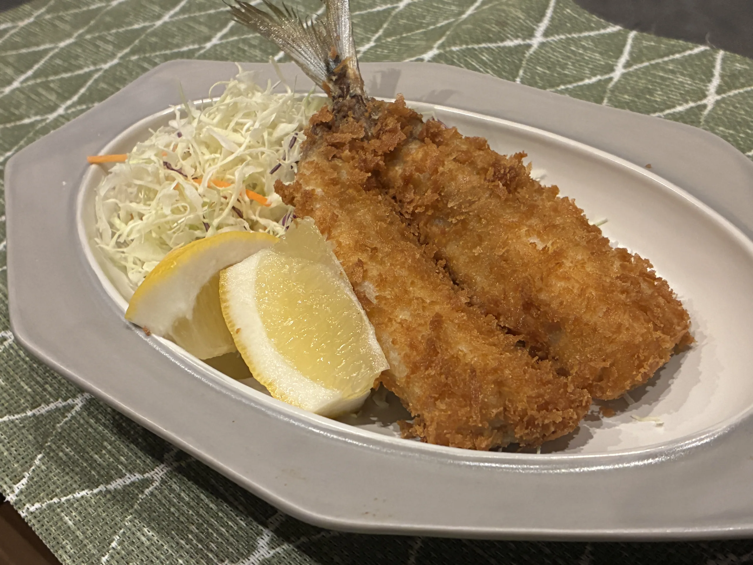 ここまで出来れば身に骨が一切ないので後は小麦粉、卵、パン粉をつけて揚げるだけです。