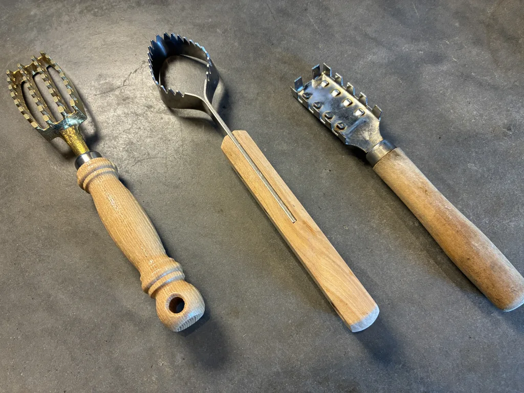右から100均のうろこ取り、魚屋さんが考えた燕三条のうろこ取り、使い勝手抜群の真鍮うろこ取りです。