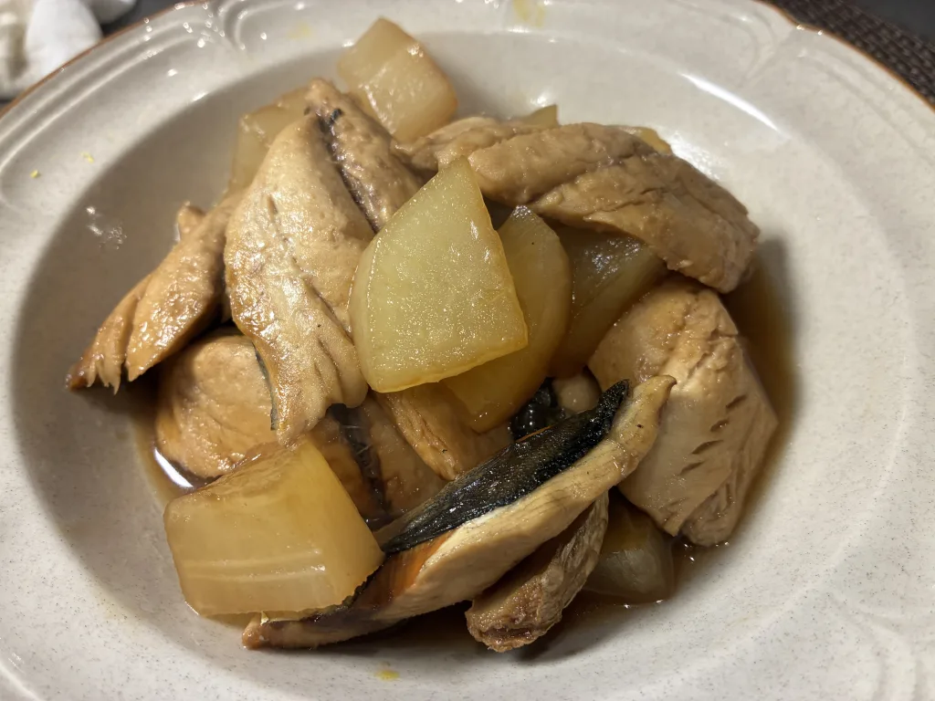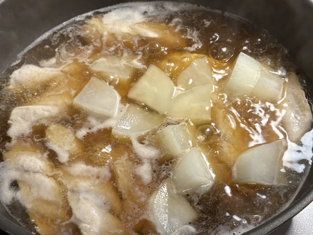 フライパンにフクラギ、大根、調味料を入れて20、30分煮込みます。