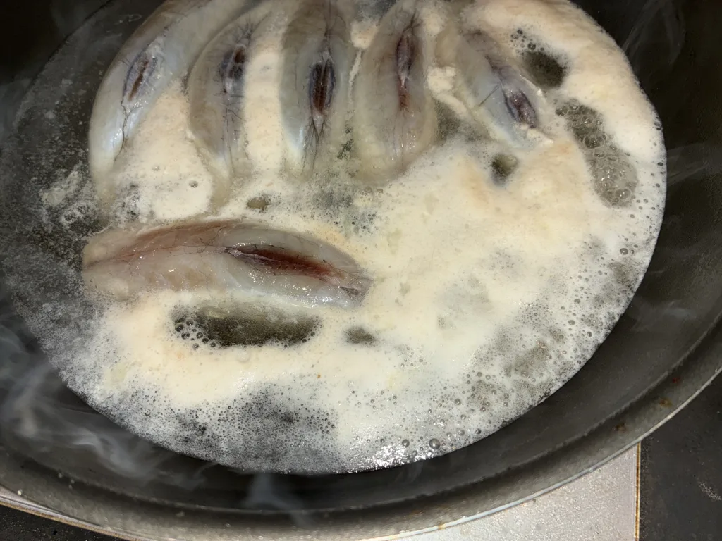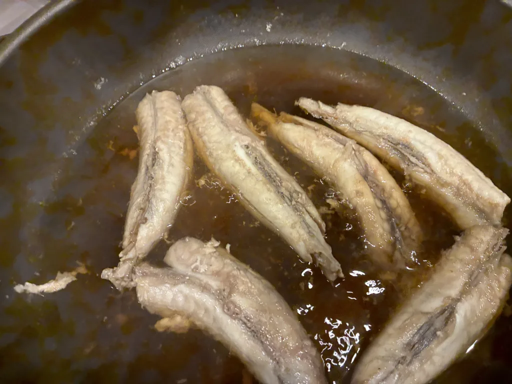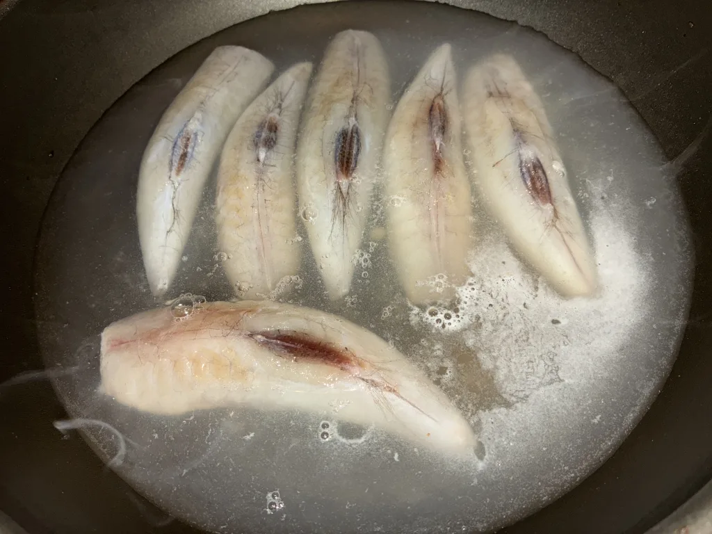 フライパンにフグを入れて水と調味料を入れて煮込みます。